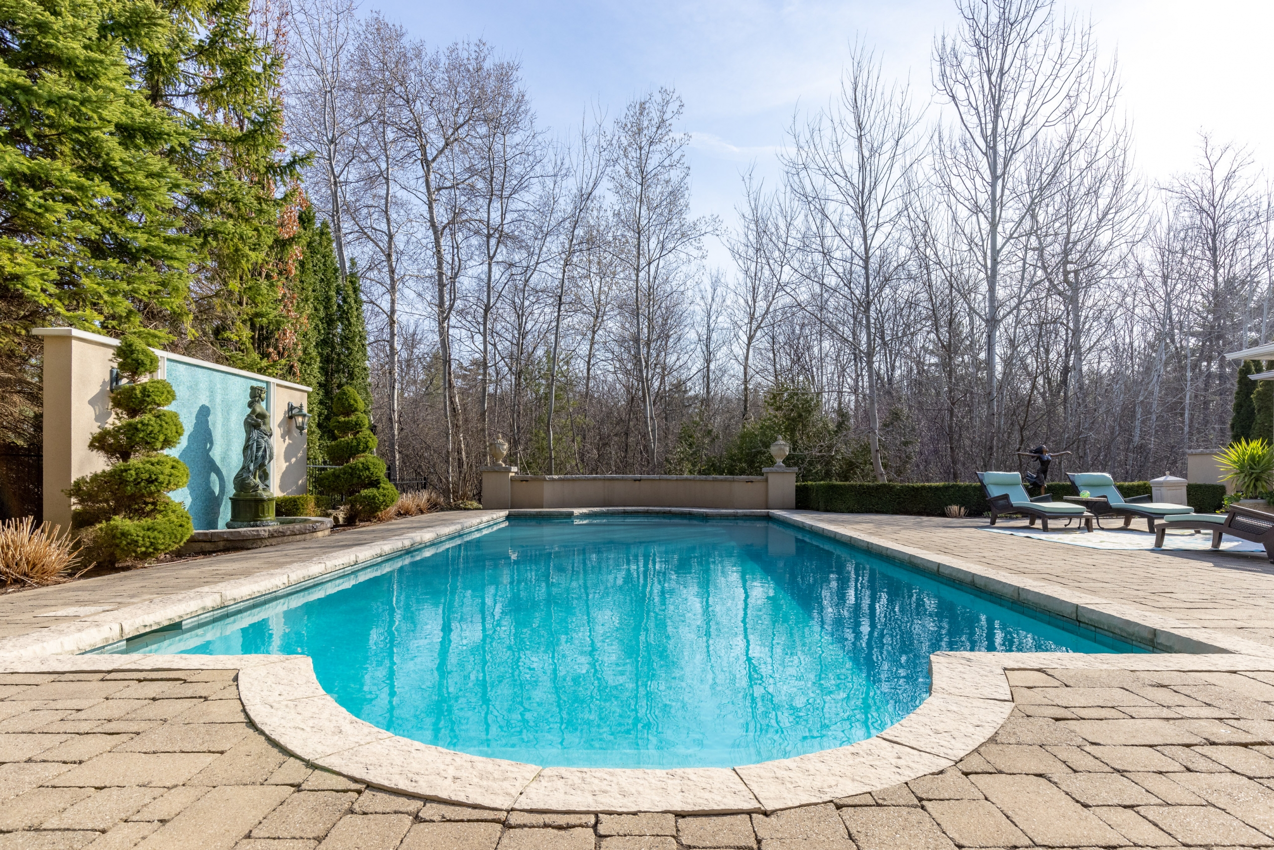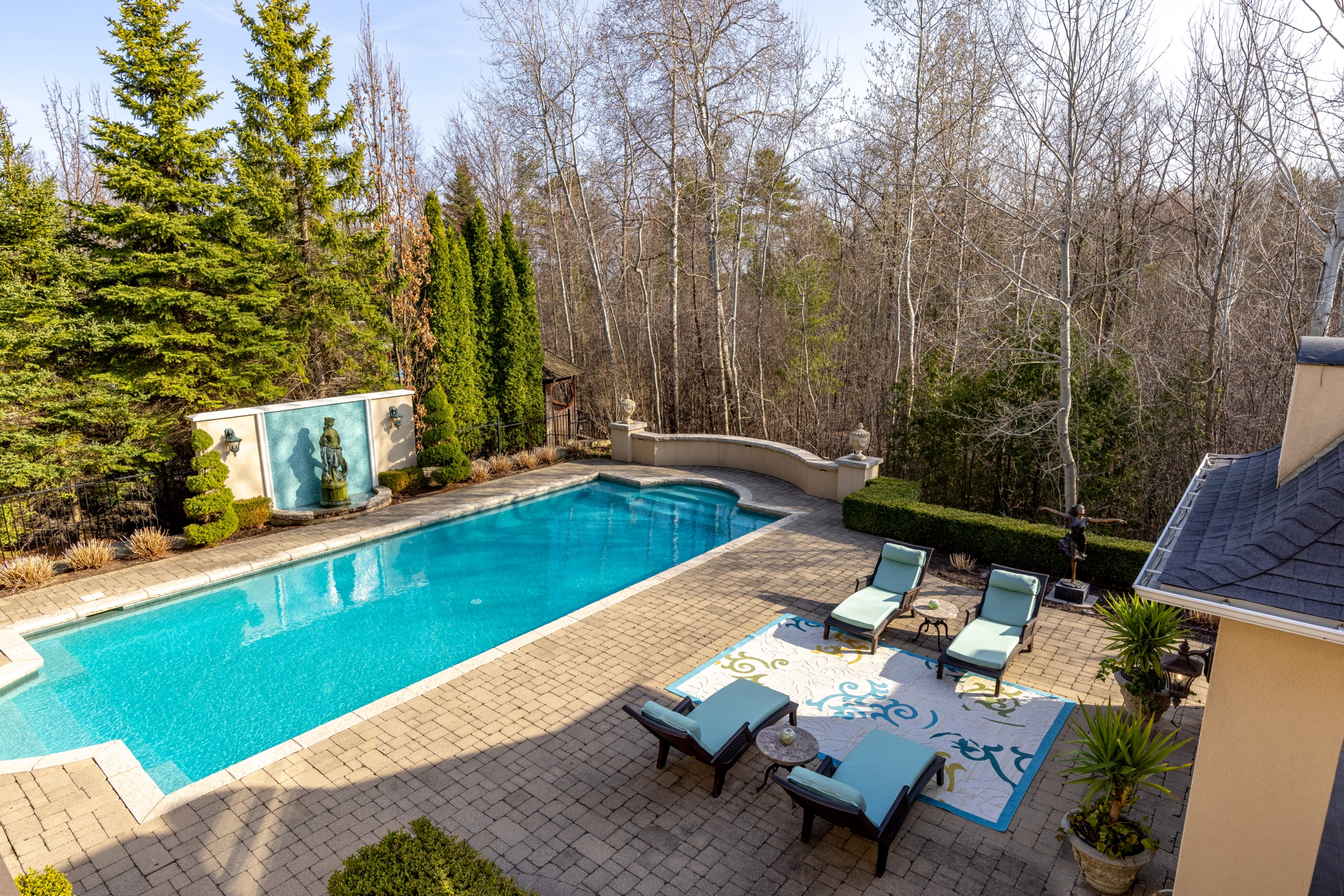 Luxury Indoor – Outdoor Living – this custom built home is sure to impress with the perfect combination of luxurious interiors flowing out to expansive, retreat-like outdoor spaces. Situated in a quiet cul-de-sac on a private ravine lot backing onto Sixteen Mile Creek. The elegant architecture and craftsmanship signal the attention to detail found throughout. 19’ soaring ceilings in the foyer open to the stately staircase which serves as a focal point in this unique layout. Rich hardwood floors with inlays, custom plaster crown mouldings and coffered ceilings set the tone. The formal living and dining rooms are beautifully appointed. Work from home in the comfort of the main floor office with walkout to a private terrace. The gourmet kitchen offers marble floors, large centre island with prep sink, chef’s pantry and SubZero, Dacor & Miele appliances. French doors lead from the kitchen to a large stately terrace with gas BBQ for outdoor cooking overlooking the forested ravine. The great room with impressive gas fireplace, built-ins and surround sound leads to the third terrace off this level. The upper level offers a sumptuous principal suite with 4-pc ensuite, double sided gas fireplace and private terrace. The impressive dressing room is fully fitted with custom built-ins, shoe closets, two islands with chandeliers and a luggage closet. A 3-pc bathroom completes the dressing quarters. Three additional bedrooms, each with ensuite bathroom and walk-in closet, and the laundry room complete this level. Glide down the pneumatic elevator to the lower level with radiant heated floors, featuring exercise room, 5th bedroom, theatre room, workshop, mudroom with access to garage and ample storage areas. The backyard oasis features a heated gunite pool, gazebo with automated screens, cabana, change room, outdoor shower, and patio misters. The heated driveway, front walkways and garage make for easy winter months. Touchscreens throughout the property allow control of lighting, audio, blinds, fireplaces and security system. Surrounded by lush ravine, walking trails and only minutes to wonderful neighbourhood amenities, such as highly rated private and public schools, shopping, and recreation facilities for the whole family.