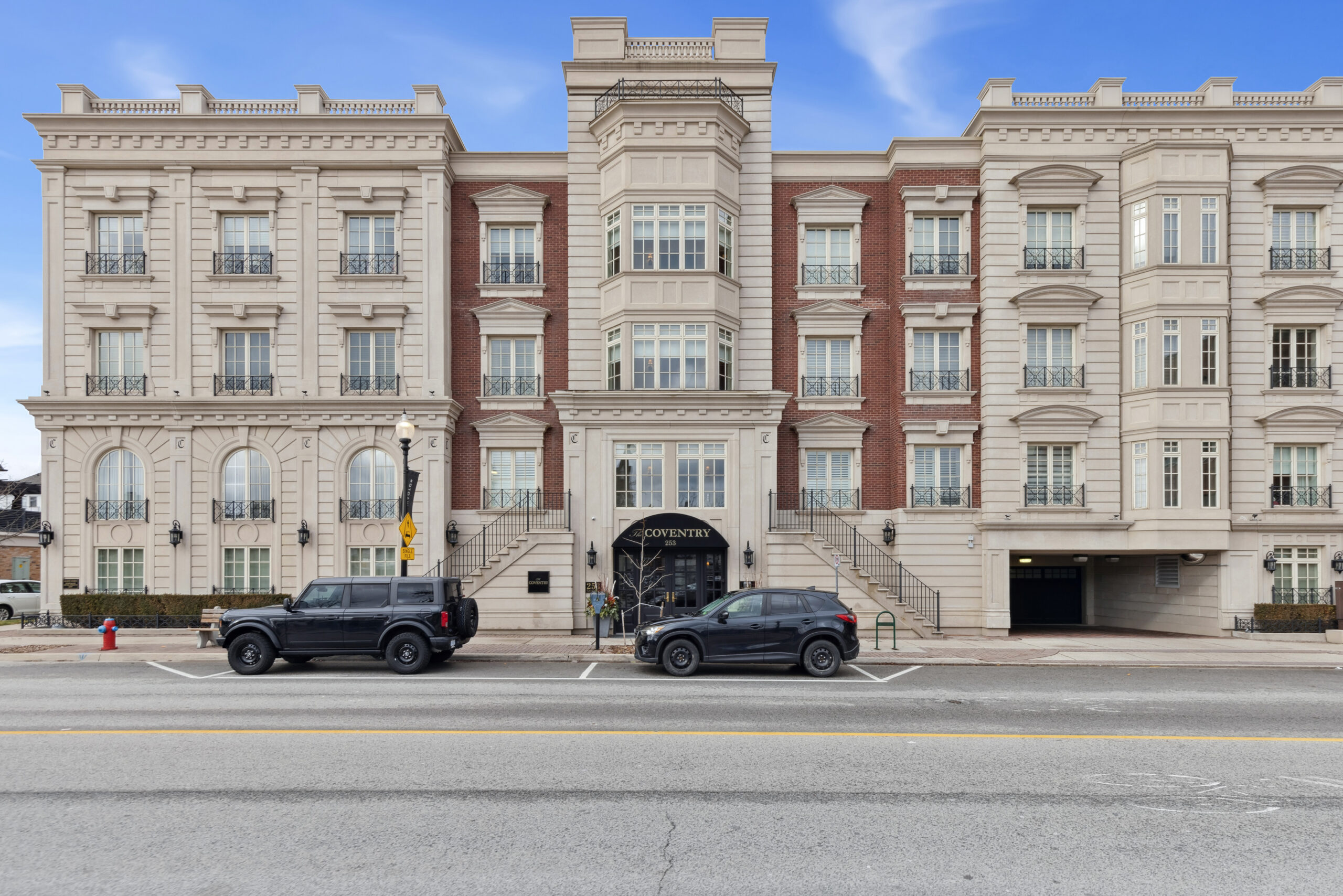Welcome to a remarkable residence in downtown Oakville’s most prestigious boutique condominium building “The Coventry”. This exceptional home spans 2,461 square feet of thoughtfully designed living space, offering an exclusive living experience with only two suites sharing the elevator on the third floor.The heart of this home features a stunning Great Room anchored by a double-sided fireplace and french doors that open to a covered terrace. Entertain small intimate dinners or large gatherings in your formal dining room area.The gourmet kitchen stands ready to inspire culinary creativity with its premium appliances, including a Wolf wall oven and microwave, Dacor gas cooktop, KitchenAid refrigerator, dishwasher, and warming drawer. A dedicated servery enhances the kitchen’s functionality, while elegant touches like the Waterford dining room chandelier and Venetian glass fixture in the breakfast nook add sophisticated charm.The primary bedroom suite offers the ultimate retreat, featuring a custom bookcase with pop-up TV, luxurious five-piece ensuite with heated marble floors, and a generous walk-in closet. A separate “wing” takes you to the second bedroom with its own ensuite and walk-in closet, providing optimal privacy. A 2pc powder room and laundry area complete this area. Beautifully crafted built-in cabinetry adorns the study for work at home office.The 317-square-foot covered terrace becomes an outdoor oasis with its brand-new gas barbecue and cozy gas fireplace. Throughout the residence, 9-foot-9-inch ceilings create an atmosphere of grandeur, complemented by designer wallcoverings and premium finishes. Modern conveniences include a Crestron home automation system.Two side-by-side indoor parking spaces, a storage locker, and access to the rooftop terrace complete this offering. Located steps from downtown Oakville’s finest amenities and waterfront, this residence epitomizes sophisticated, low-maintenance living at its finest.